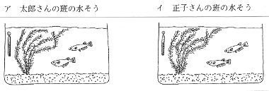 | 太郎さんと正子さんのクラスでは,班ごとに下のような水そうをつくり,メダカの飼育を始めました。 | ||||||||||