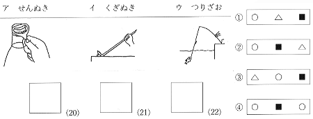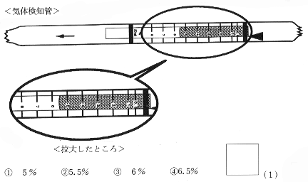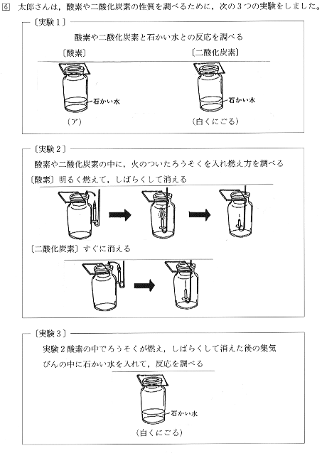| (1) | 実験1のアは,酸素の中に石灰水を入れてふったときの結果です。その結果を,次の@から までの中から1つ選んで,その番号を□の中に書きましょう。 | |